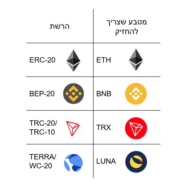 שימו לב: הכתובות של רשת זו זהות לכתובות של רשת ERC-20, ולכן חשוב לשים לב שאתם ברשת הנכונה.